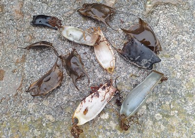 Plenty of Mermaid purses, several Nursehound egg cases also Spotted Ray, Thornback and Small-eyed Ray.